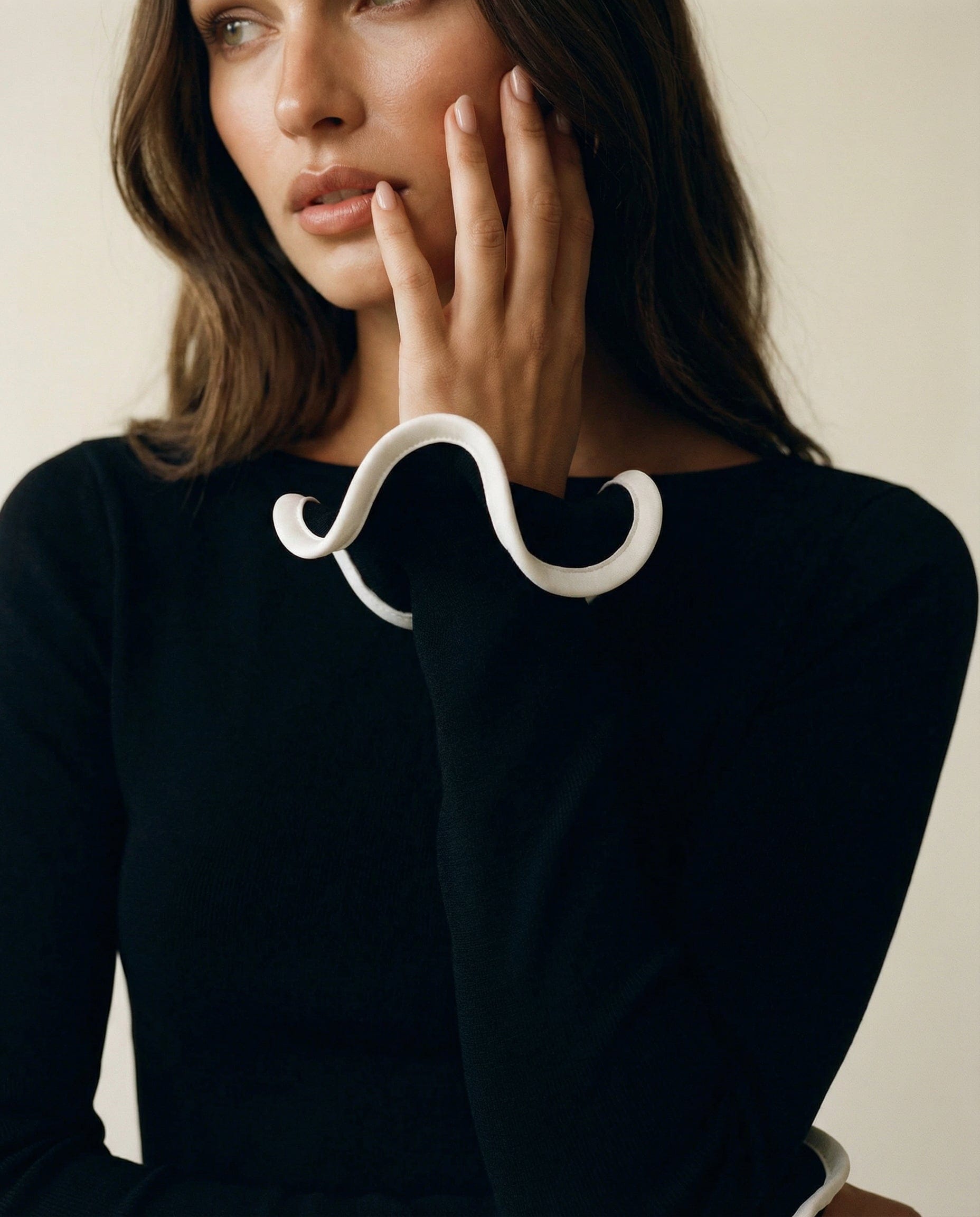 Długi rękaw i delikatny dekolt łódka tworzą elegancką, zbalansowaną górę, dzięki czemu cała uwaga skupia się na dopracowanym dole sukienki. Ten model jest idealny na wieczorne wyjścia, eleganckie kolacje i wszystkie okazje, w których chcesz wyglądać stylowo, ale niewymuszenie.