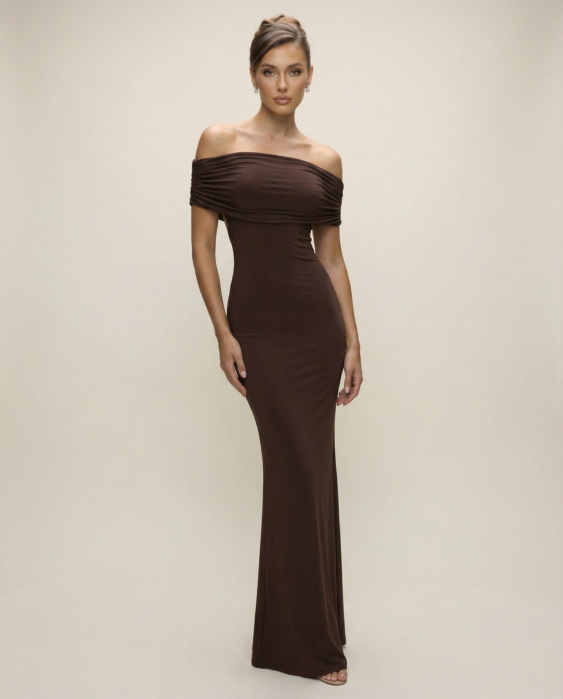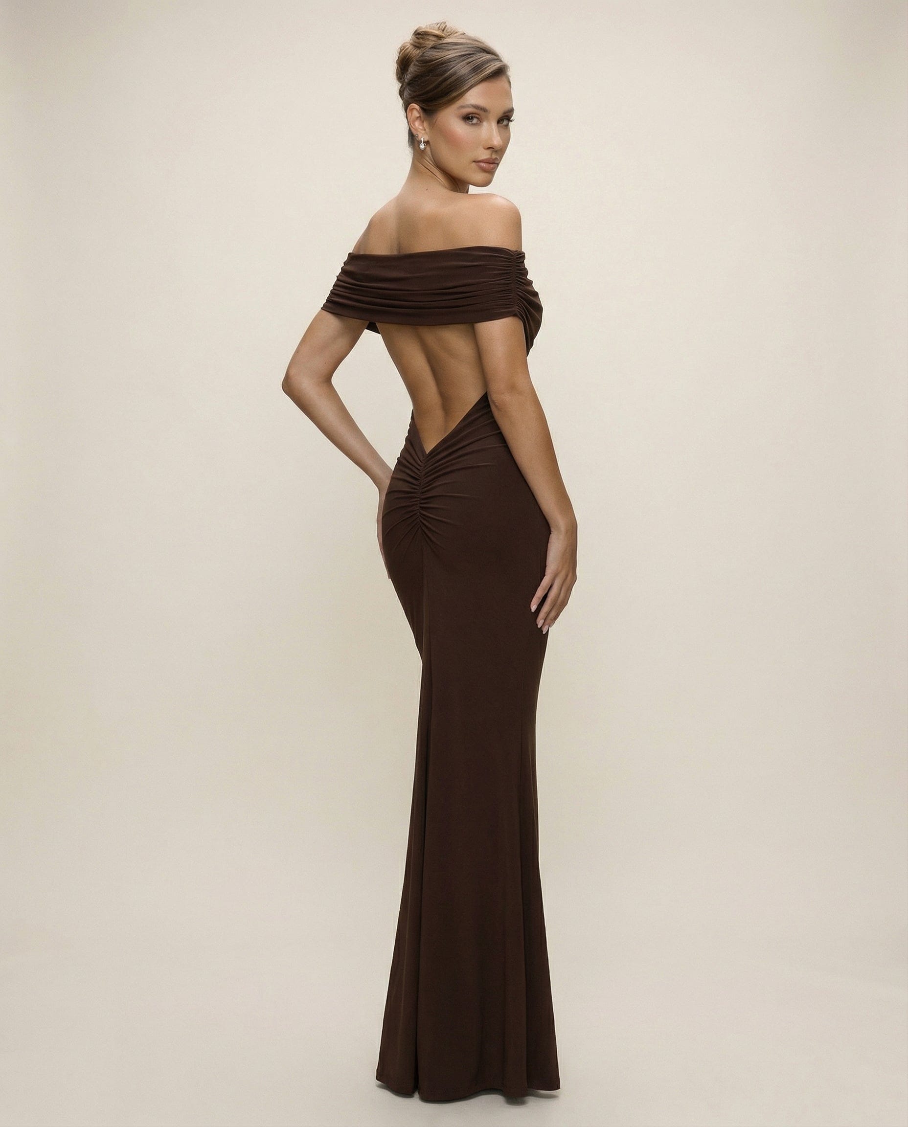 LIVIA – Długa Elegancka Sukienka Hiszpanka z Odkrytymi Plecami Czekolada