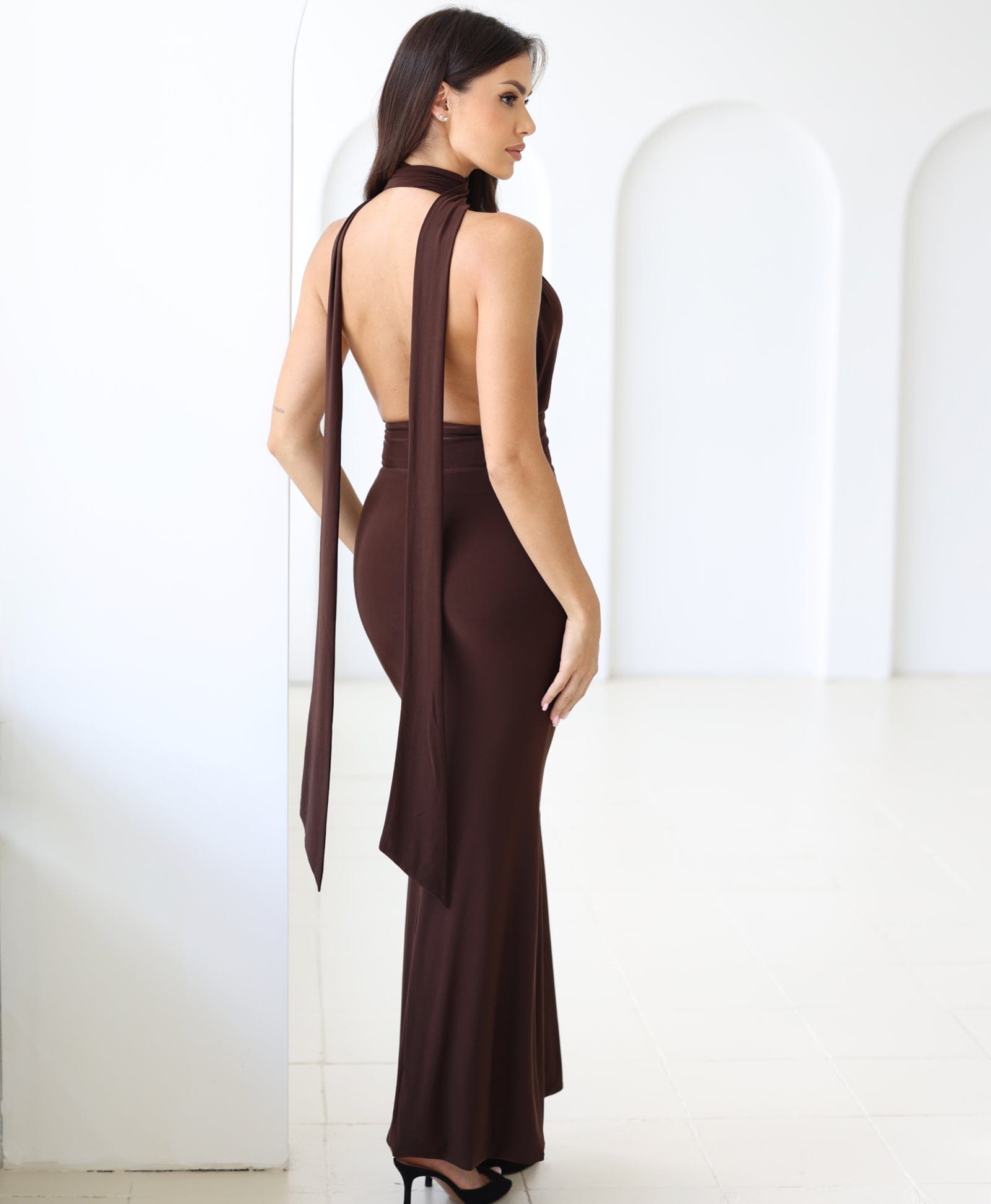 Zmysłowa forma i pełna elastyczność stylizacji. Naya to czekoladowa sukienka maxi, która łączy efektowny dekolt z elegancją i kobiecą siłą wyrazu. Głębokie wycięcie w kształcie litery V pięknie eksponuje biust i wydłuża szyję, a szerokie pasy materiału wokół szyi możesz stylizować na dwa sposoby –