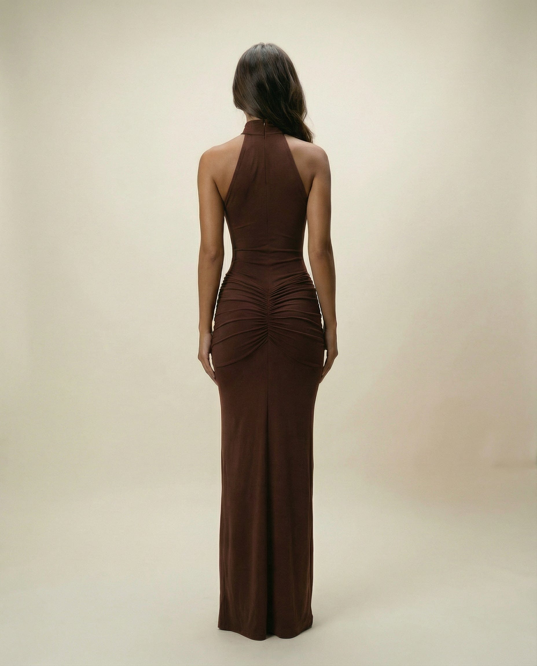 SERENA – Sukienka Maxi z Marszczeniem i Zabudowaną Górą Czekoladowy