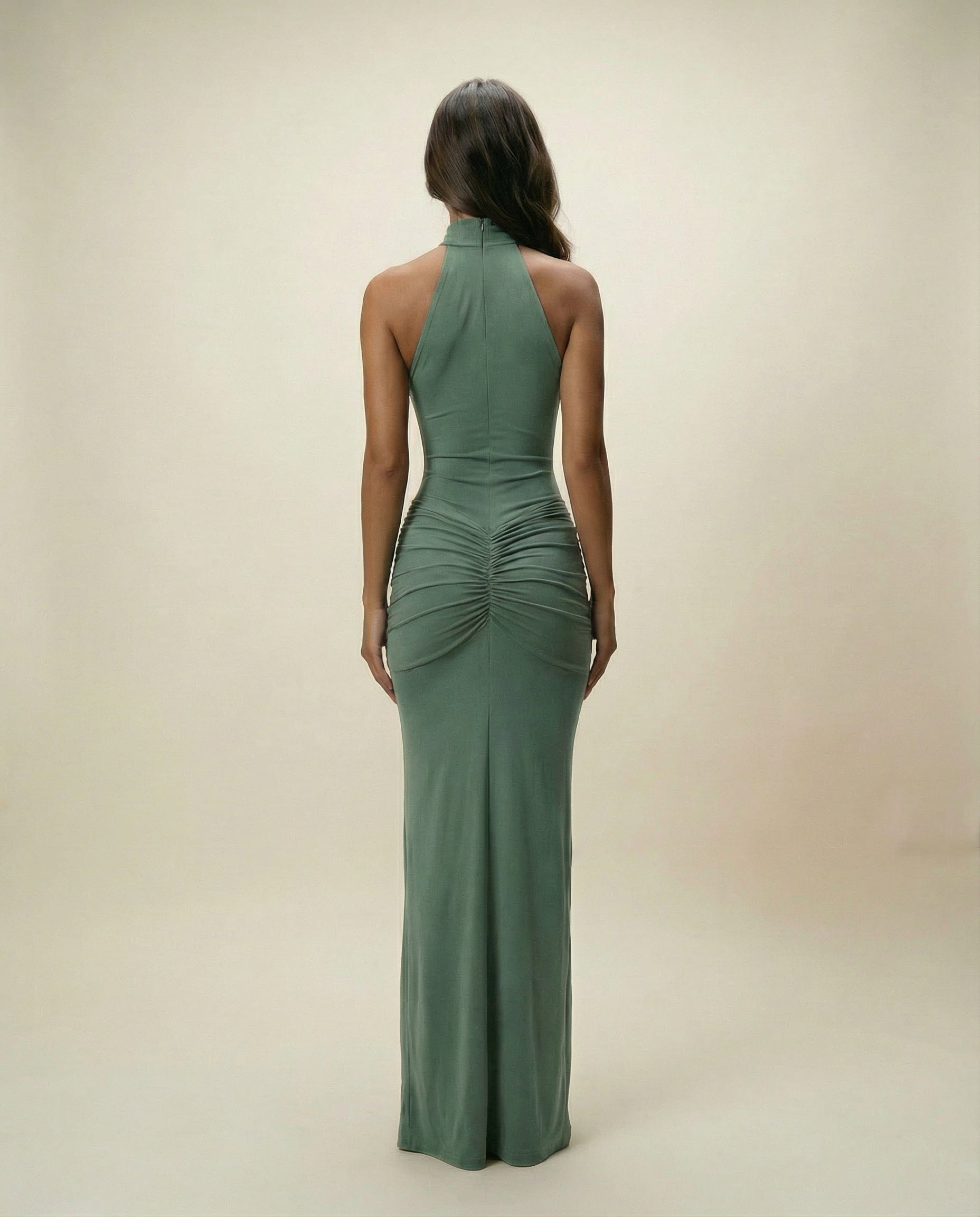 SERENA – Sukienka Maxi z Marszczeniem i Zabudowaną Górą Szałwiowy