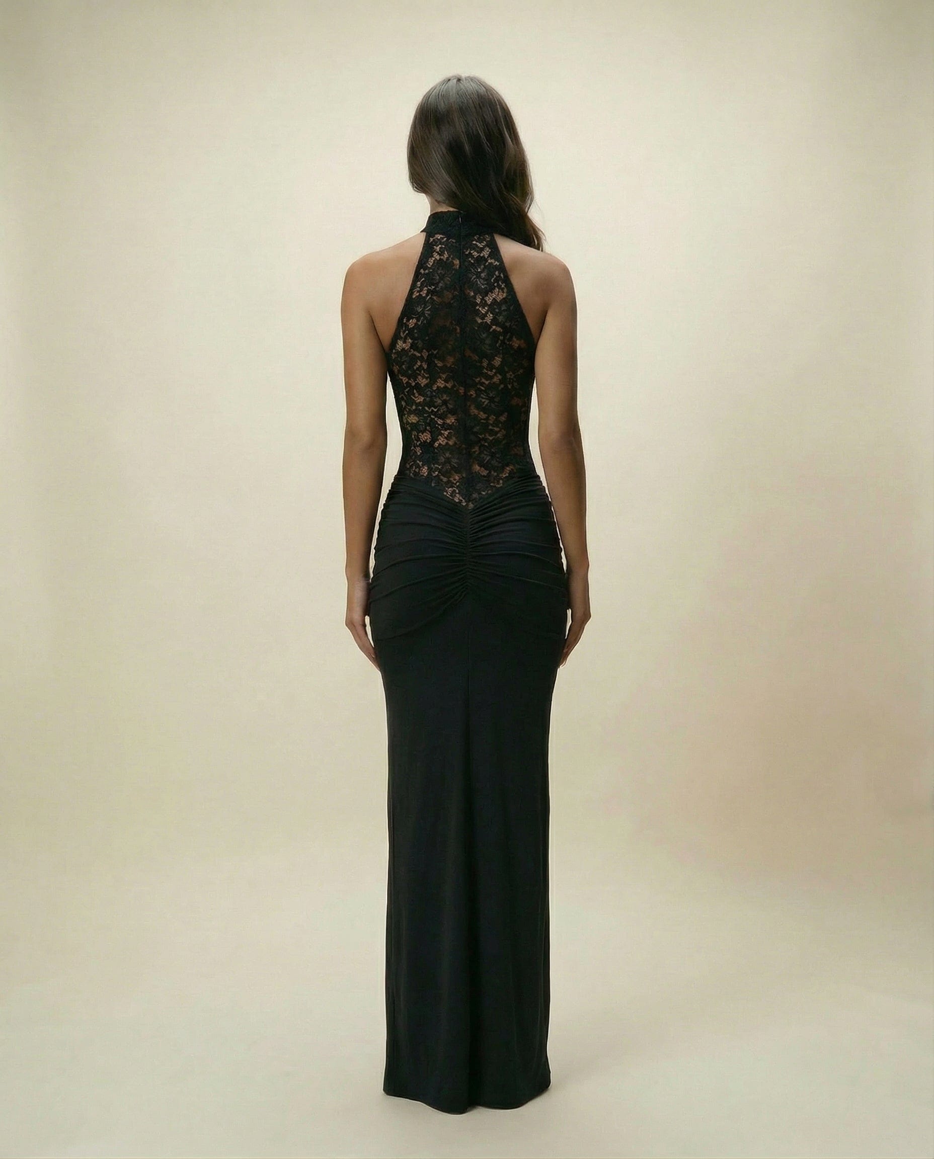 SERENA – Sukienka Maxi z Marszczeniem i Zabudowaną Górą z Koronki